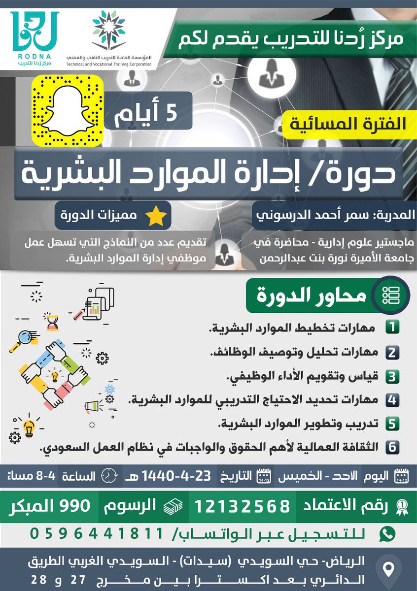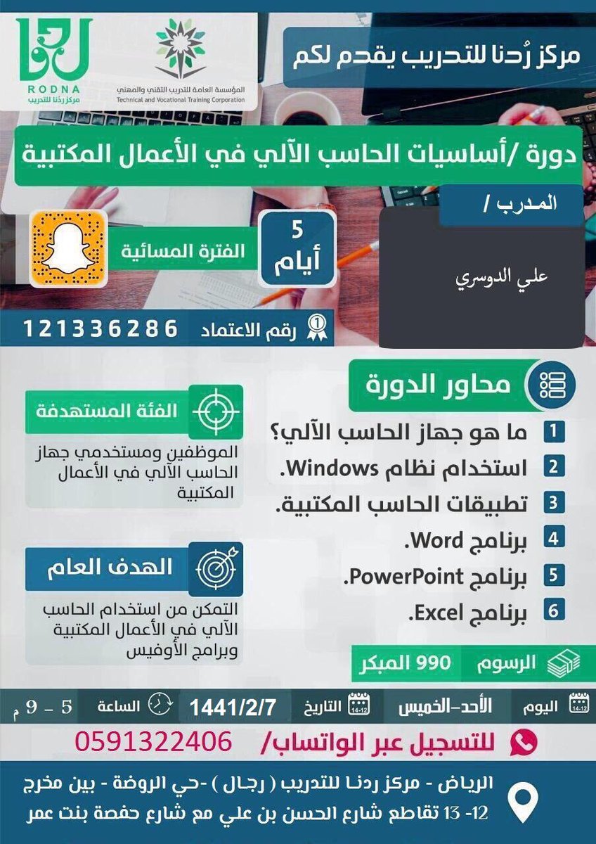 مركز ردنا للتدريب. الوطن الغالي وفق رؤية ٢٠٣٠ وأيضا من واقع المسؤولية المجتمعية حمل مركز ر دنا النسائي للتدريب على عاتقه ضرورة تطوير مهارات وقدرات فتيات هذا الوطن وتقديم كل ما يسهم في. دورات تدريبية بشهادات معتمدة من المؤسسة العامة للتدريب التقني والمهني في مختلف المجالات. للسيدات و الرجال الدورات الإدارية. مركز تدريب مرخص ومعتمد من المؤسسة العامة للتدريب التقني والمهني.